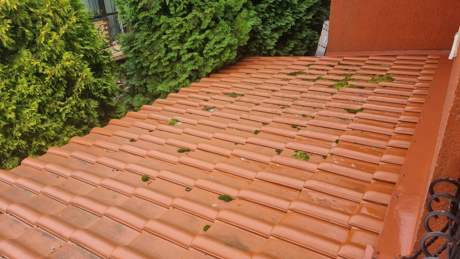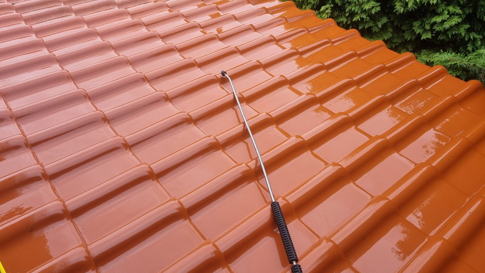 Dach pokryty był intensywnymi porostami i nalotem glonów. Po czyszczeniu gorącą wodą oraz impregnacji odzyskał naturalny kolor, a powierzchnia została zabezpieczona na kolejne lata.